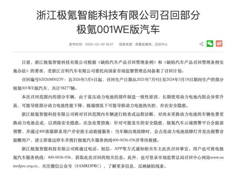 近日,吉利与欣旺达相关纠纷已快速达成和解。与此同时,极氪汽车同步启动旗下部分车型召回工作。本次召回涉及2021年7月8日至2024年3月18日期间生产的部分极氪001WE版汽车,共计38,277辆,召回自2026年3月6日起正式实施。