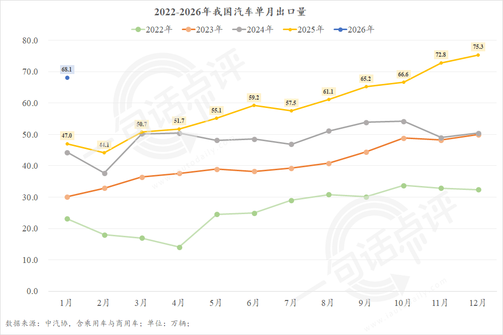 数据显示,1月我国汽车出口量为68.1万辆,同比增长44.9%。虽说,这一数字没能再创单月新高,但它仅次于去年11月的72.8万辆和12月的75.3万辆,成为我国汽车出口单月历史上第三高的表现。