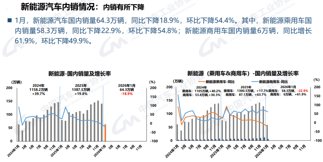 只是,受到政策切换的影响,1月国内售出的新能源汽车为64.3万辆,同比下跌18.9%。其中,1月新能源乘用车国内销量为58.3万辆,同比下跌22.9%。而新能源商用车则继续同比增长61.9%至6万辆。