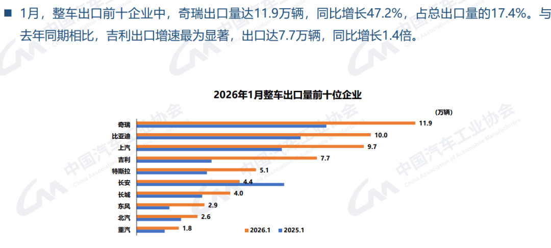 而出口量不断攀升,还得益于各大自主车企的推动。比如,1月整车出口量前十的车企中9家都是自主车企,仅特斯拉一家外资车企,其中奇瑞、比亚迪和上汽位居前三,吉利虽只排名第4,但1月的7.7万辆,同比增长140%。