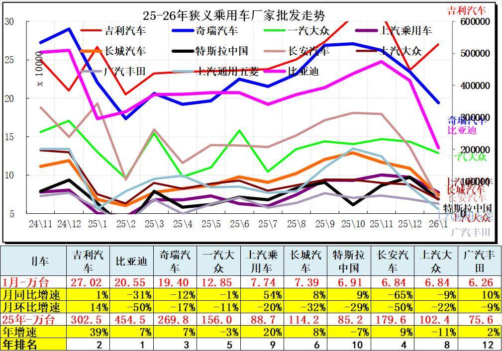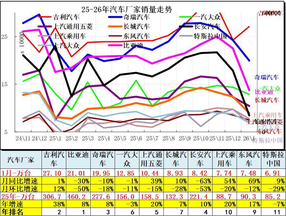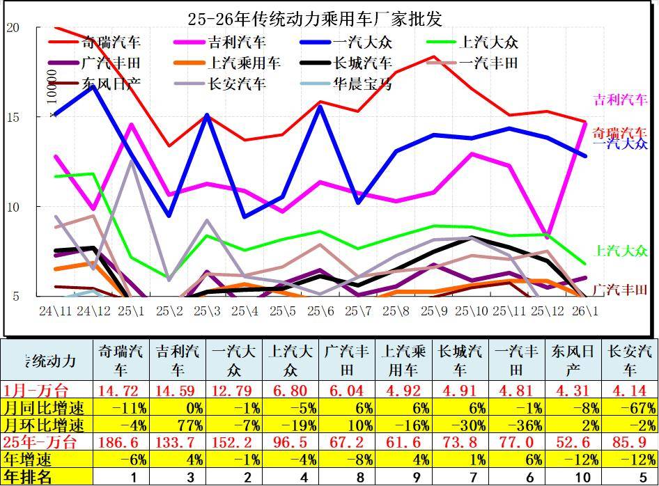 2026年乘用车自主车企全面领先。1月主力车企总体较弱,自主超强,合资车企1月走势较弱。吉利汽车领军,比亚迪第2名,奇瑞1月保持第3,前三的规模日益接近。合资的一汽大众和上汽大众等表现较平稳。