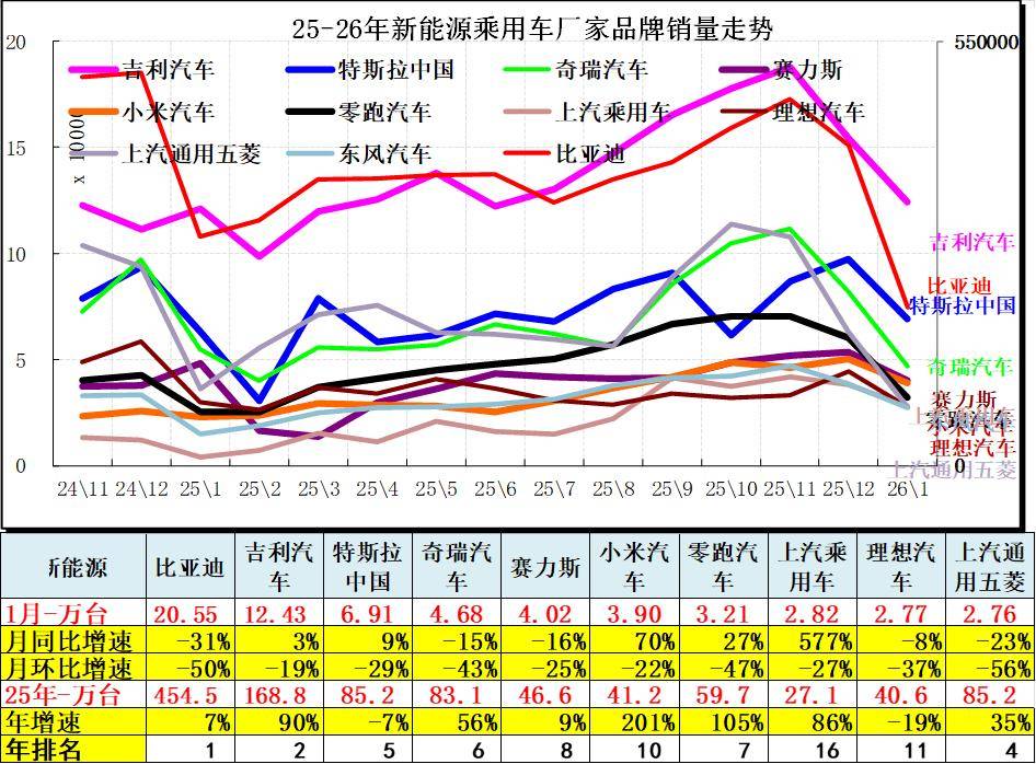 2025年新能源车厂家竞争格局相对稳定,头部厂家增长较快,二线厂家逐步加速增长。1月的吉利、特斯拉、赛力斯、小米的走势较强,比亚迪等1月走势较慢。全国车市剧烈分化,省区间增速差异大,厂家增速差异大。