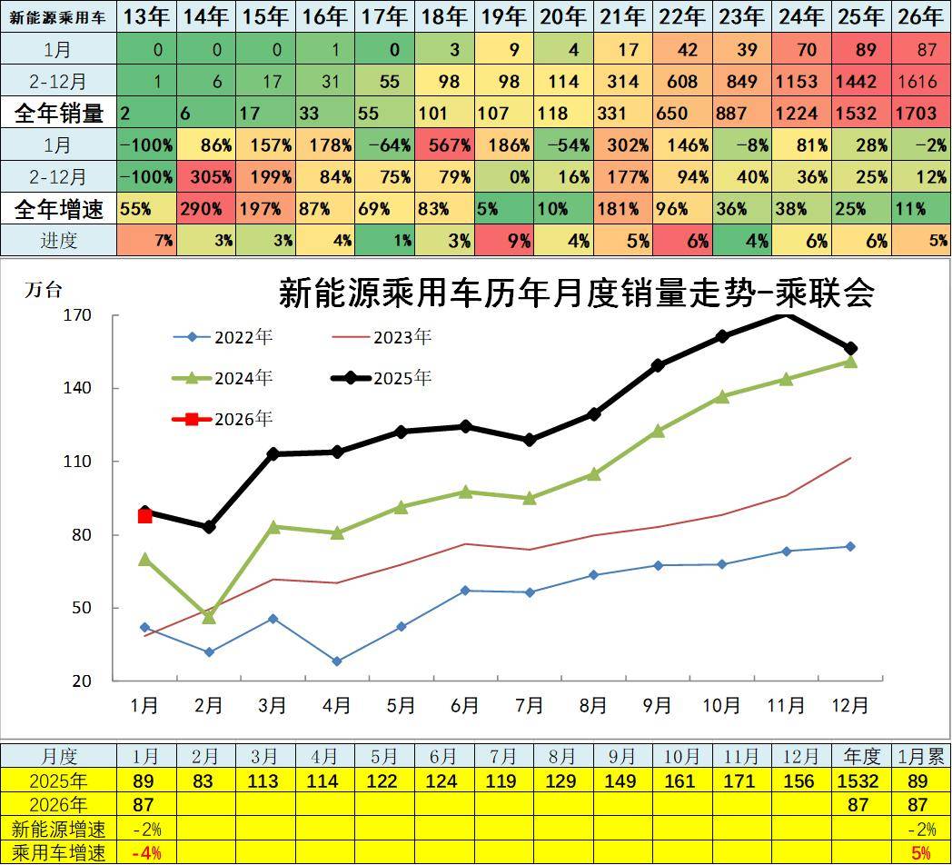 2026年1月新能源乘用车厂家销量合计87万台,同比下降2%。2025年上半年报废更新补贴、厂家降价、新车等带来较好增长,下半年出口拉动增长。2026年的走势面临政策调整的压力较大。