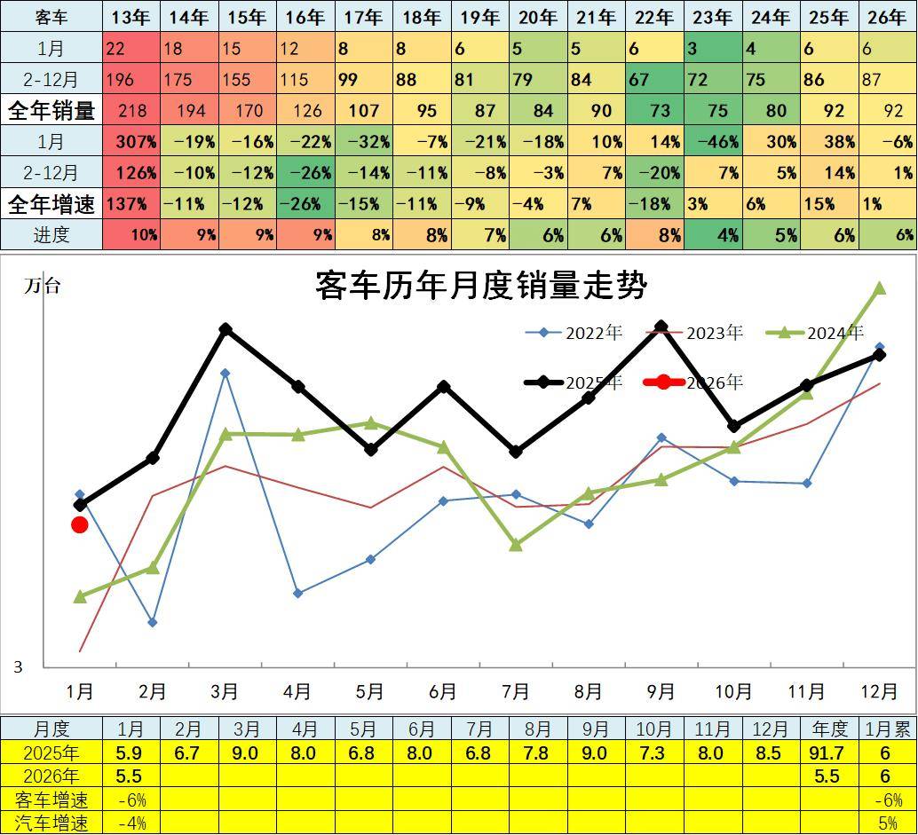 2023年全年累计厂家销量客车合计销量75万台,累计增速3%;2024年累计客车合计销量80万台,累计增6%;2025年累计客车合计销量92万台,累计增速15%;2026年1月客车合计销量5.5万台,同比降6%,出口和新能源物流车的拉动效果一般。