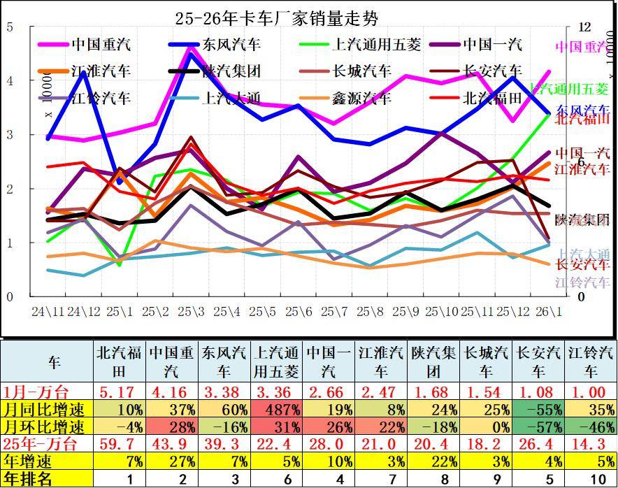 2026年的卡车主力厂家分化较明显,头部厂家表现较强,五菱和东风等同比去年1月暴增,陕汽、江淮、江铃的轻型卡车1月同比表现较好。