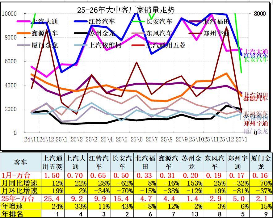 2026年客车走势相对平稳,头部厂家销量总体较强,基本都是物流类轻客和微客的市场需求波动。2025年五菱和长安、大通的商用车走势较好,1月宇通、长安的环比回落较大。