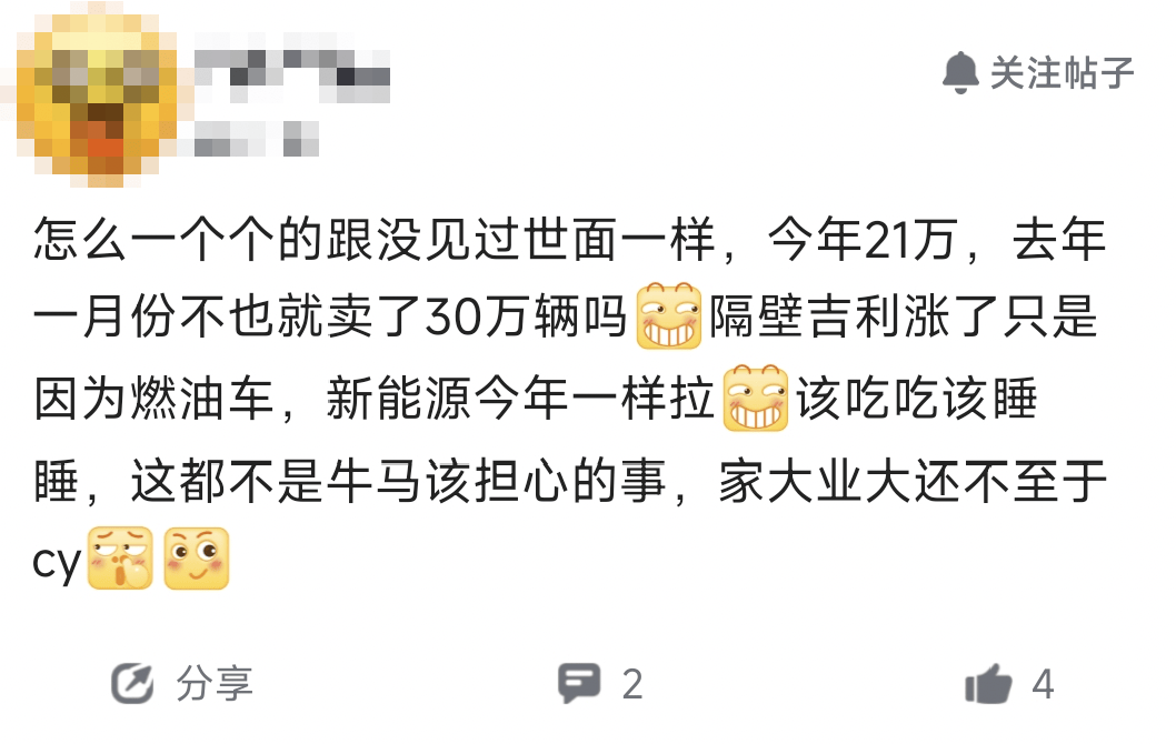 所以面对很多人对比亚迪前景和未来的担忧,我们正好在职场APP上看到了认证为比亚迪的员工,发表的几句对1月份销量的表述,我觉得这就是一种自信。他表示,怎么一个个就跟没有见过世面一样,今年21万(辆),去年1月份不也就卖了30万辆,并且表示该吃吃该睡睡,这不是牛马该担心的事,家大业大还不至于……