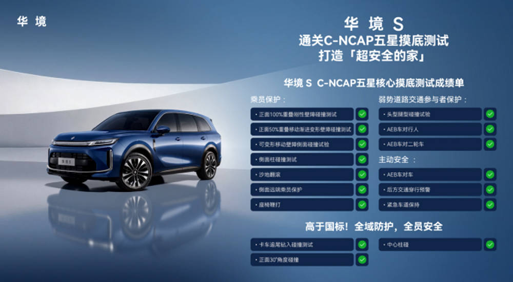 将于今年上半年上市的华境S,以“6人全员守护”为安全研发理念,从车身结构、材料应用到主被动防护,全方位构建全域安全屏障。近日,该车在中汽中心C-NCAP五星摸底测试中,取得了耀眼的安全成绩。