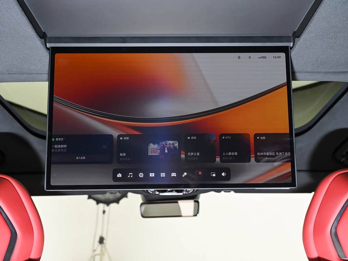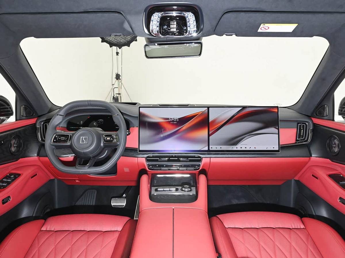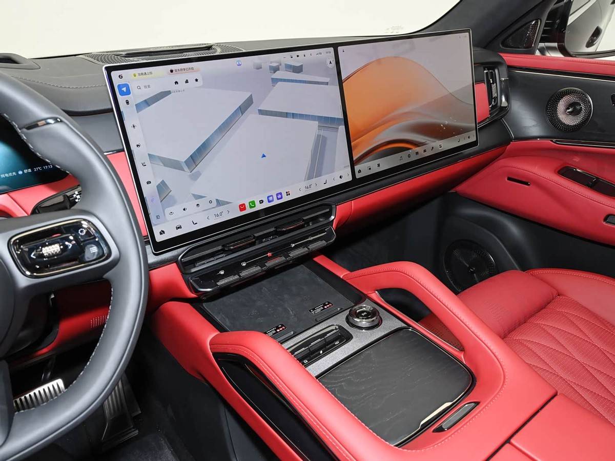 细节方面,新车前排整体延续了极氪9X的设计风格,中控屏与副驾娱乐屏采用连屏设计,主驾驶前方配备液晶仪表和HUD抬头显示。方向盘换装运动造型,中央通道设有运动扶手,车顶采用翻毛皮材质包裹,整体运动感较强。车顶还配有星辉钻彩灯环和晶钻物理按键,提升了车内质感。