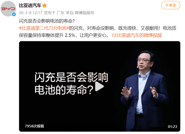 3月8日消息,比亚迪汽车再度谈及了“闪充是否会影响电池的寿命”这一话题。