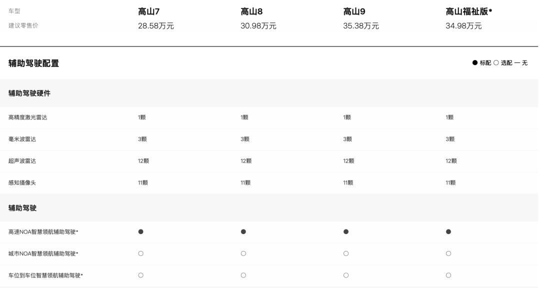 而高山只标配高速领航辅助,想要车位到车位级领航辅助,需要加26000元选装。