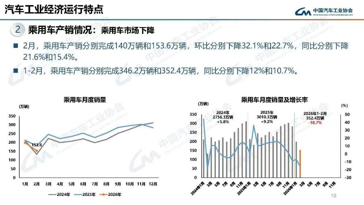 受政策切换,需求提前释放以及春节假期、车企年初发布新技术和新产品预告,导致消费意愿进入观望阶段等多重因素的影响,今年2月中国车市遭遇明显下行压力。3月11日,中国汽车工业协会发布了2月汽车工业产销情况的相关数据。