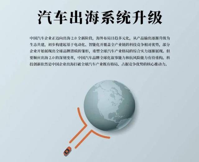 中国汽车企业正迈向出海2.0全新阶段,海外布局日趋多元化,从产品输出逐渐升级为生态共建,初步构建起基于电动化、智能化并覆盖全产业链的科技竞争相对优势,部分企业开始展现出全球品牌潜质的雏形,重塑全球汽车产业格局的综合实力逐渐展现。但要顺应出海2.0的深刻变革,中国汽车品牌全球化叙事能力和抗风险能力有待重构。科技创新依然是中国企业出海打破全球汽车产业既有格局、占据竞争优势的核心推动力。